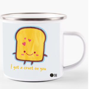 - Mug: Start your day with a smile and a warm drink in this cute mug featuring the “I got a crust on you” design.