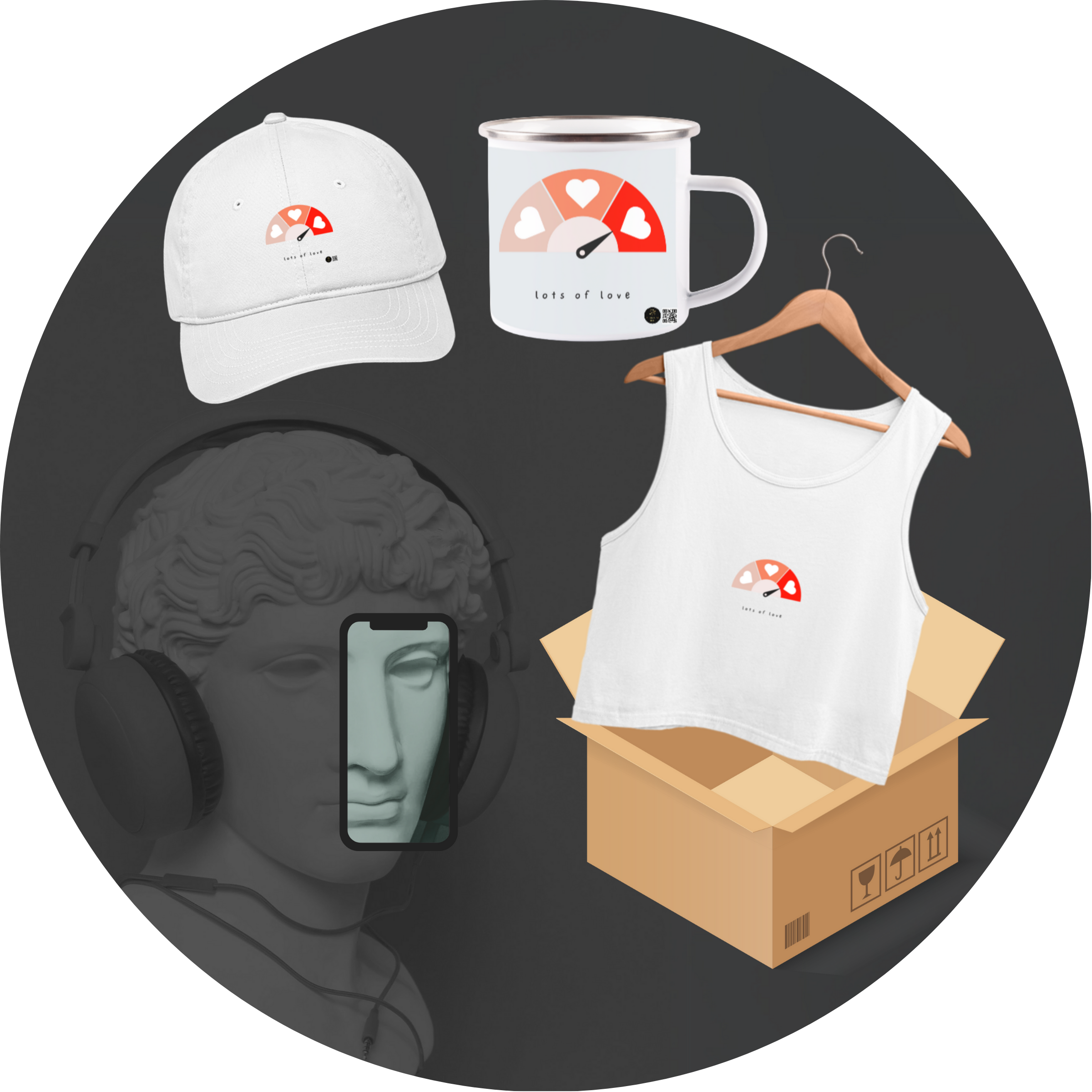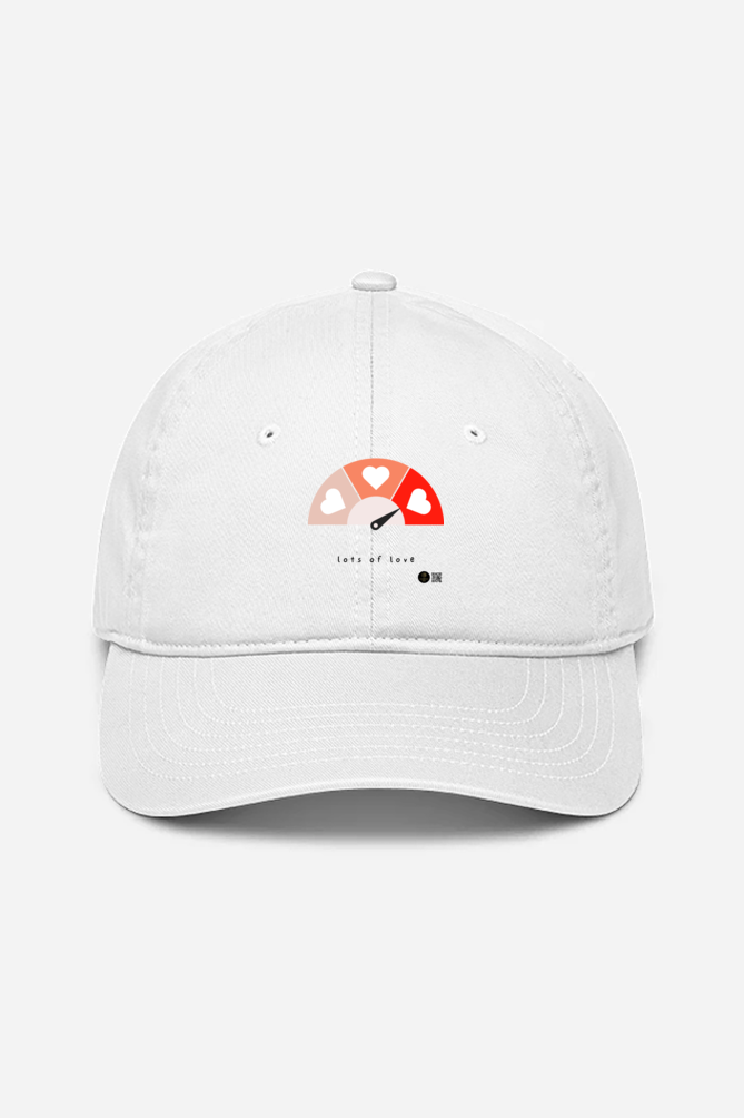 • Baseball Cap: A crisp white cap with a playful “Lots of Love” graphic and a heart-shaped love gauge, perfect for sunny days or adding a stylish touch to any outfit.