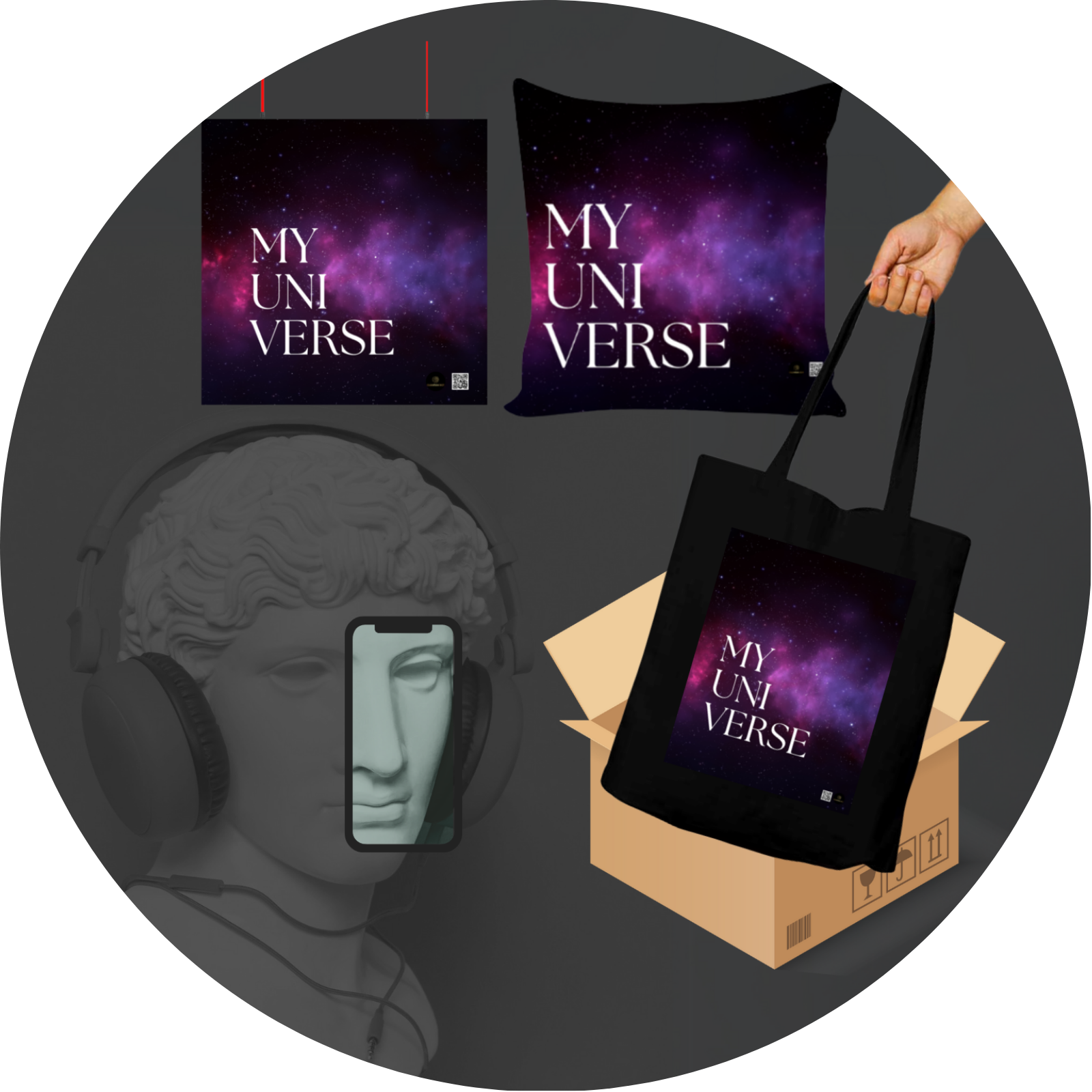 Step into the cosmic dream with the Quantum Bundle – My Universe, a stunning collection that brings the beauty of the galaxy to your everyday life. This three-piece set includes a 10×10 inch poster, 16×16 inch cushion cover, and a tote bag, all featuring a breathtaking nebula design with “My Universe” typography.