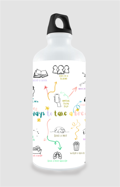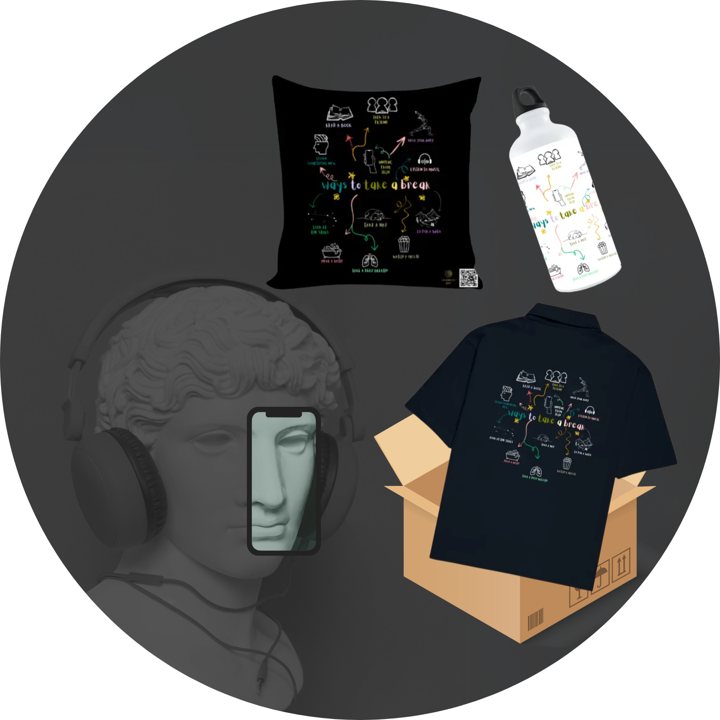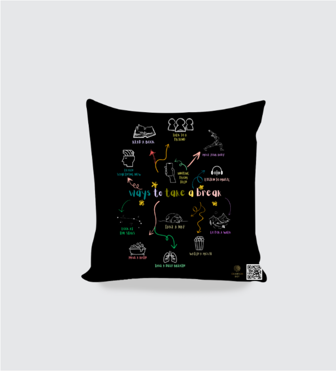 Step into a lifestyle of mindful pauses and wellness with the Quantum Bundle – Ways to Take a Break. This all-in-one set brings together three functional and inspiring pieces—a stylish black oversized shirt, a soft cushion cover, and a white sipper bottle—each beautifully designed with vibrant illustrations reminding you to take meaningful breaks throughout your day.