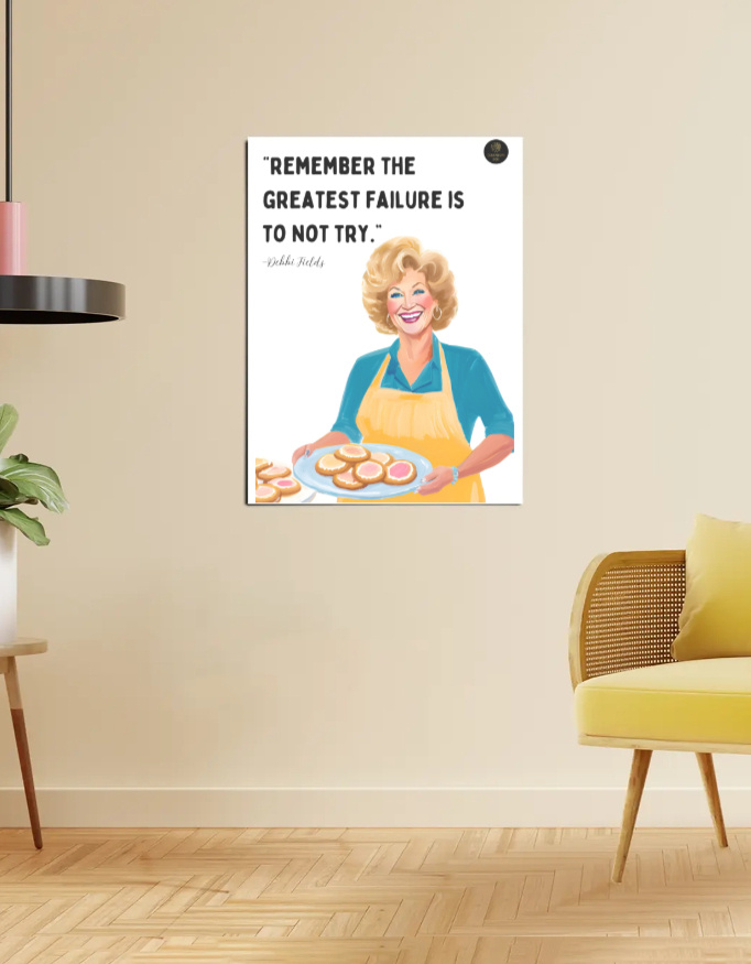 Brighten your space with this Debbi Fields motivational framed poster, featuring her uplifting words on courage and perseverance. A perfect reminder that success begins with simply trying, this cheerful artwork is ideal for kitchens, offices, classrooms, and creative studios. An inspiring gift for dreamers, doers, and anyone needing encouragement to take the first step.