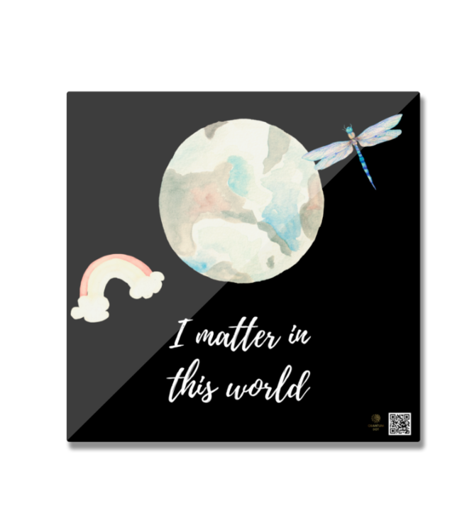 Add a touch of positivity and warmth to your space with this beautifully designed Square Fridge Magnet. Featuring a light-toned watercolor Earth, delicately framed by a vibrant rainbow and graceful dragonflies, this design is a gentle reminder that “I Matter in the World.”