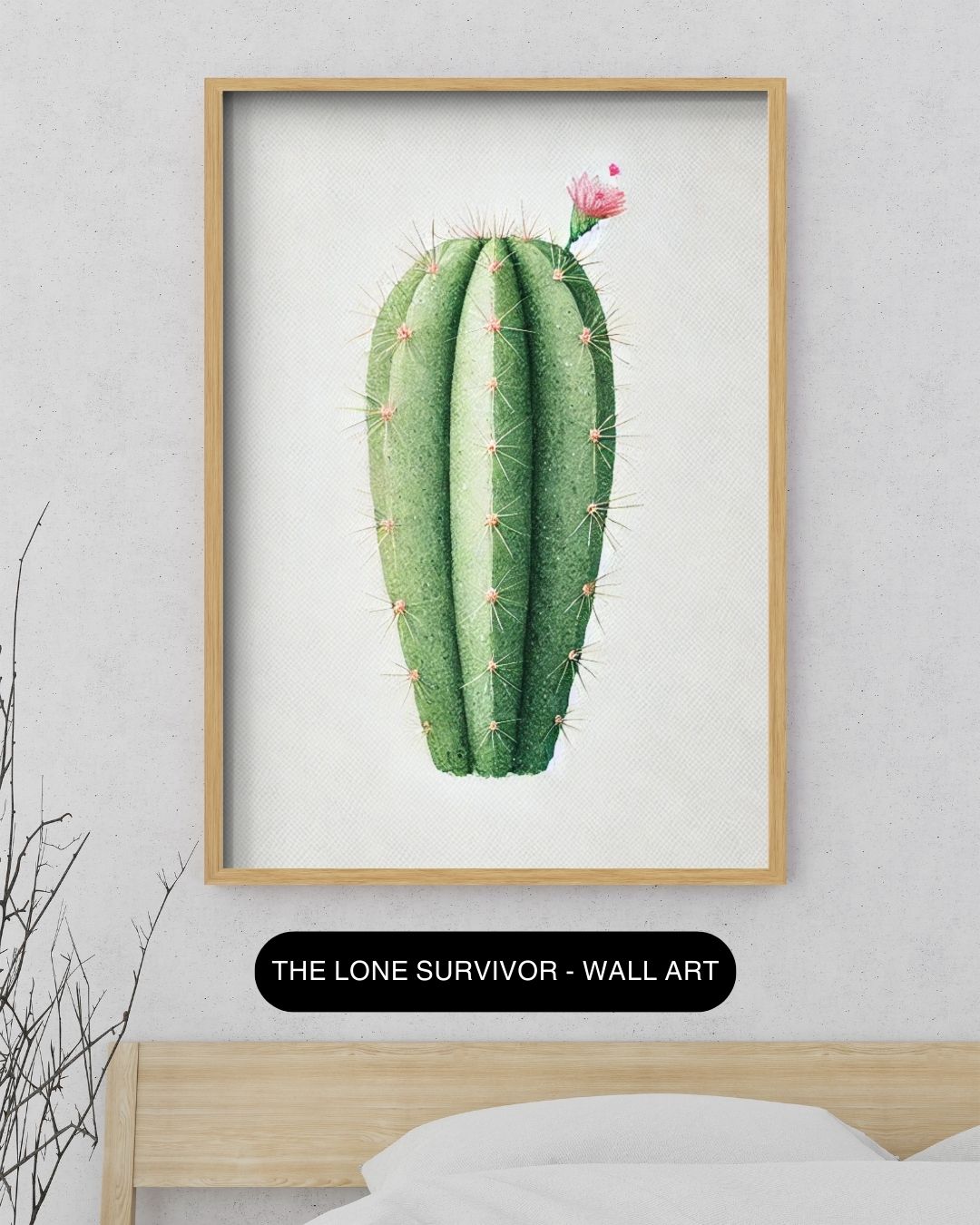 Experience the stark beauty of solitude with The Lone Survivor, a striking artwork featuring a solitary cactus standing resiliently against a desert backdrop. Its minimalist design makes it a powerful statement piece for any space.