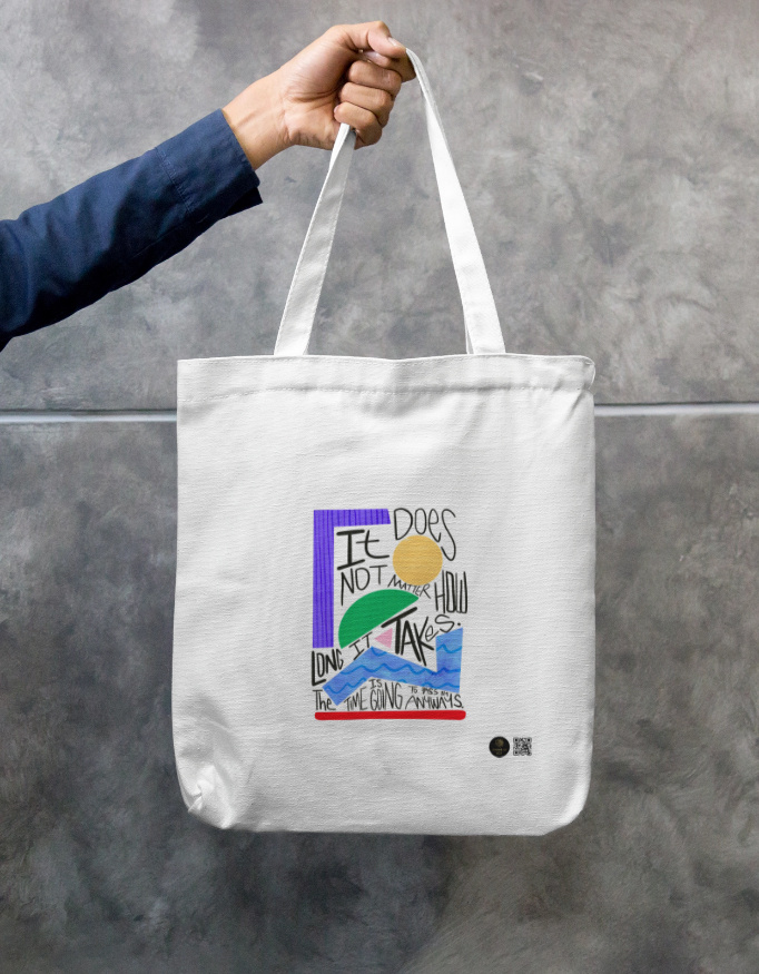 The bold artistic quote adds personality and inspiration to your daily routine, while the spacious interior ensures practicality.
