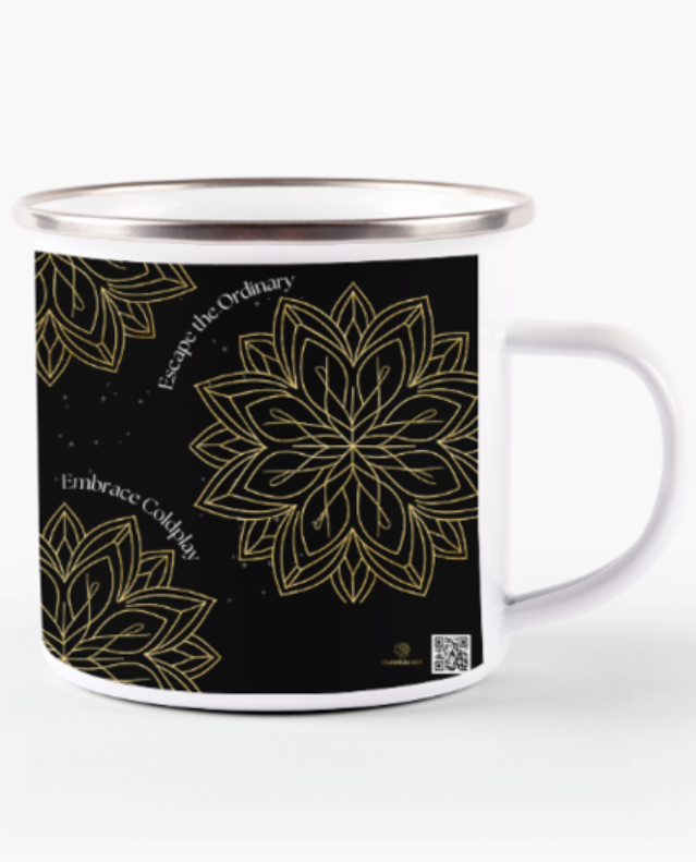 Sip your favorite beverage with a touch of celestial charm and musical inspiration with this Coldplay-themed enamel mug. Featuring a stunning golden geometric floral design, set against a black starry sky backdrop, this mug captures the magic of music, the cosmos, and artistic elegance. The phrase “Escape the Ordinary, Embrace Coldplay” wraps around the design, adding an inspirational and poetic touch, making it the perfect mug for dreamers, stargazers, and Coldplay fans alike.