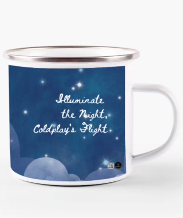 Sip in the magic of the night with the White Enamel Mug (11oz) – Illuminate the Night, featuring a stunning starry sky over a lush mountain landscape, with the poetic phrase “Illuminate the Night, Coldplay’s Flight” elegantly written across the sky. This design beautifully blends celestial wonder, adventure, and the power of music, making it the perfect companion for dreamers, stargazers, and Coldplay fans.