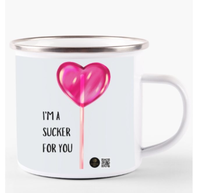 Enjoy your favorite beverages with a playful twist using this charming white enamel mug featuring a heart-shaped lollipop and the sweet message, “I Am a Sucker for You.” Designed for those who love a bit of humor and romance, this 11oz enamel mug is lightweight yet durable, making it perfect for morning coffee, cozy tea breaks, or hot cocoa moments. The smooth enamel coating ensures easy cleaning, while the sturdy handle provides a comfortable grip. Whether you’re treating yourself or looking for a cute and thoughtful gift, this fun and love-filled mug is sure to bring smiles with every sip.