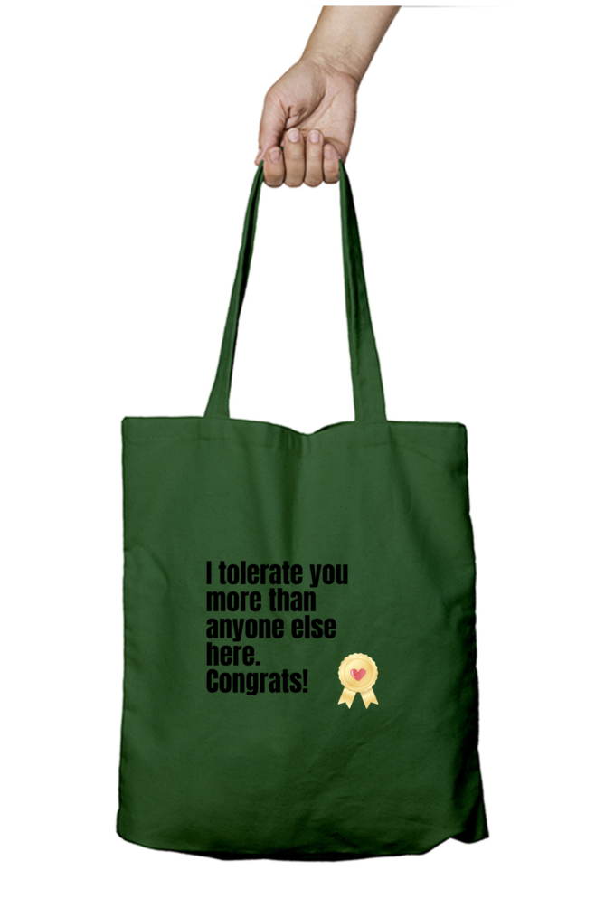 Carry your essentials with a touch of humor using this white zipper tote bag featuring the witty “I Tolerate You More Than Anyone Else Here. Congrats!” design. Perfect for work, casual outings, or as a fun gift for coworkers and friends, this tote is both stylish and practical. Made from high-quality fabric, it offers durability and ample space while keeping your items secure with a sturdy zipper closure. Whether you’re heading to the office, shopping, or running errands, this bag is a must-have for those who appreciate sarcasm and everyday convenience.