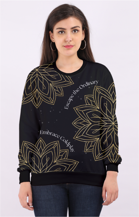 Wrap yourself in the mystical elegance of music and celestial artistry with this Coldplay-inspired AOP sweatshirt. Featuring a mesmerizing golden geometric floral design, set against a deep black starry background reminiscent of constellations, this sweatshirt is more than just clothing—it’s a statement of dreams, music, and cosmic wonder. The phrase “Escape the Ordinary, Embrace Coldplay” adds a poetic touch, making this piece perfect for those who live by the rhythm of music and the magic of the night sky.