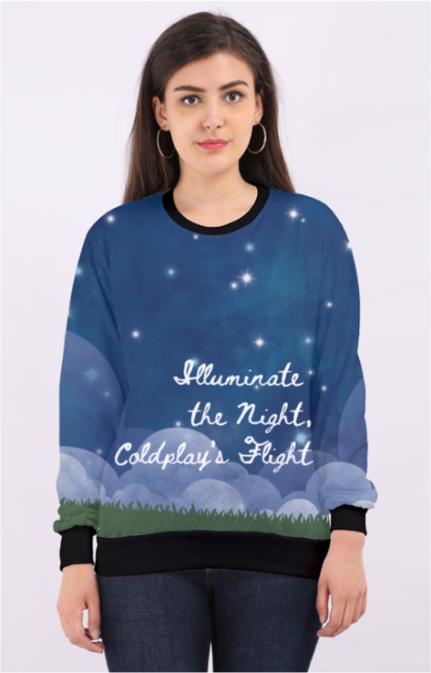 Immerse yourself in the magic of the night with this full-print Coldplay-inspired sweatshirt, featuring a stunning starry sky over a lush mountain landscape with “Illuminate the Night, Coldplay’s Flight” elegantly written across the sky. This dreamy and celestial design is perfect for music lovers and stargazers alike, bringing a sense of serenity and inspiration to your everyday wardrobe.