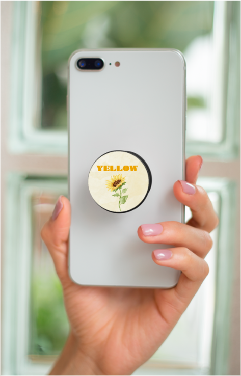 Upgrade your phone with the Yellow design pop grip, a perfect blend of style and function. Featuring a stunning sunflower print with bold typography, this phone accessory makes holding, texting, and taking selfies easier while adding a personalized touch to your device.